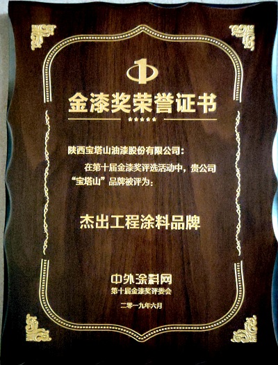 2019年6月,寶塔山漆的“寶塔山”品牌在中外涂料網第十屆金漆獎評選活動中被評為“杰出工程涂料品牌”