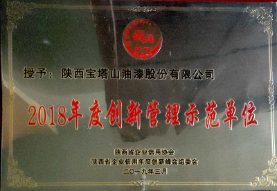 2018年3月,寶塔山漆被陜西省企業信用協會與陜西省企業信用年度創新峰會組委會評為“2018年度創新管理示范單位”