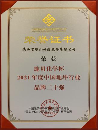 2022年3月,寶塔山漆榮獲“施貝化學杯2021年度中國地坪行業品牌二十強”。