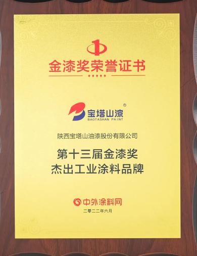 2022年6月,寶塔山漆榮獲第十三屆金漆獎“杰出工業涂料品牌”。