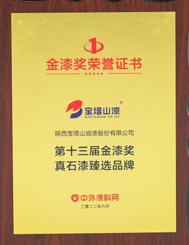 2022年6月,寶塔山漆榮獲第十三屆金漆獎“杰出工程涂料品牌”。